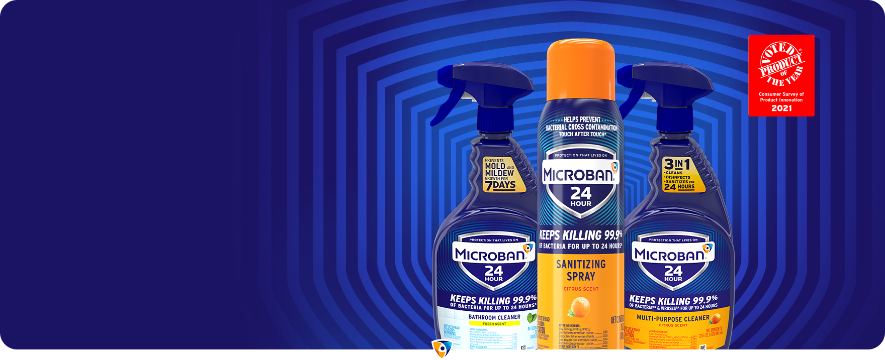 *When used as directed, effective for 24 hours against Staphylococcus aureus & Klebsiella aerogenes bacteria. Microban 24 Hour Bathroom Cleaner and Microban 24 Hour Sanitizing Spray do not provide 24-hour residual virus protection.