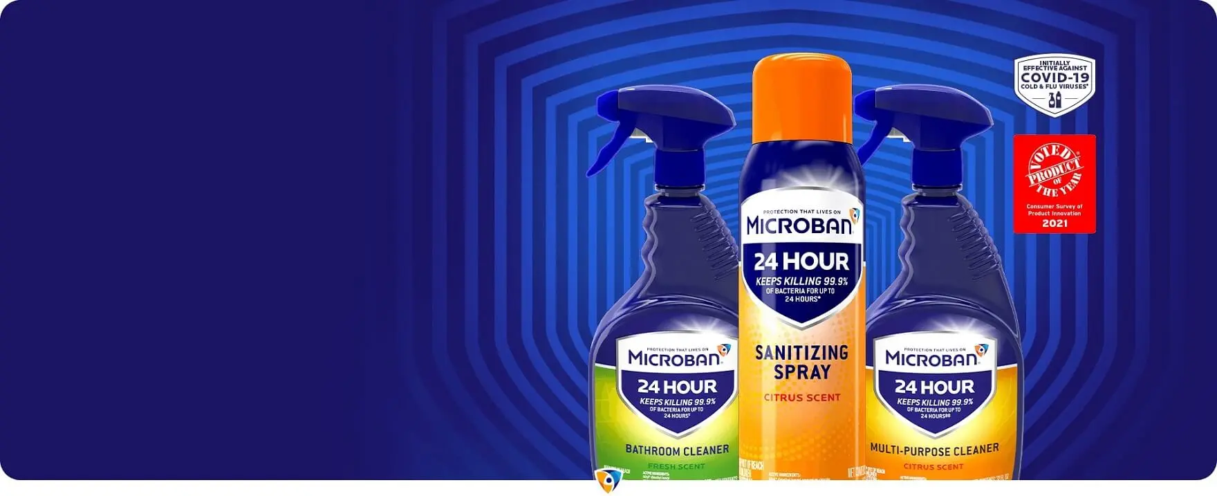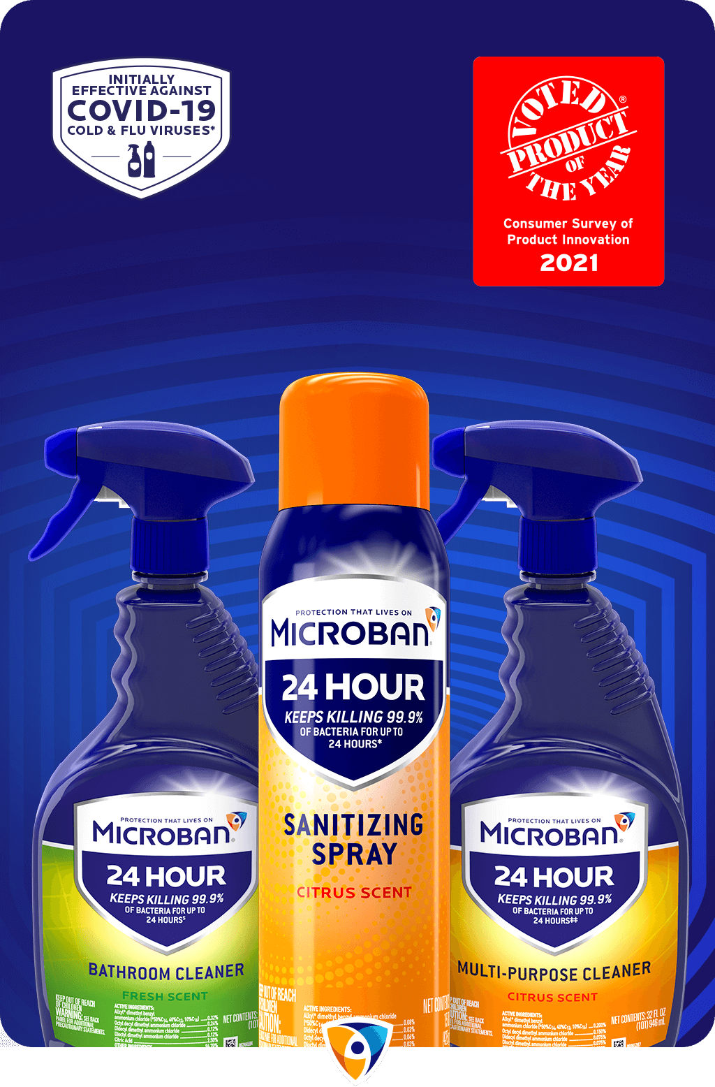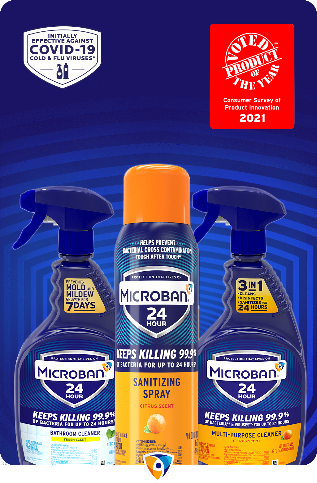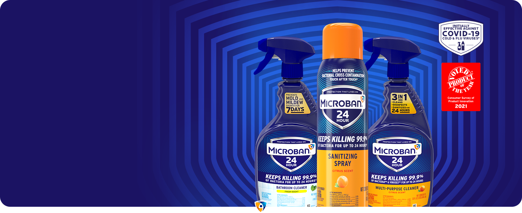 *When used as directed, effective for 24 hours against Staphylococcus aureus & Klebsiella aerogenes bacteria. Microban 24 Hour Bathroom Cleaner and Microban 24 Hour Sanitizing Spray do not provide 24-hour residual virus protection.